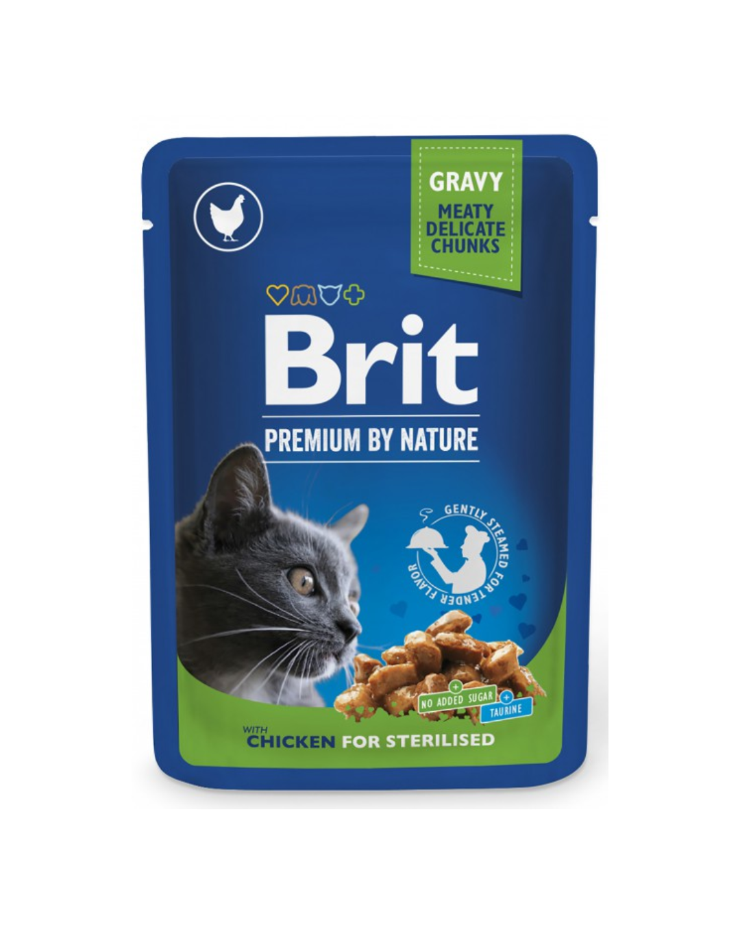 Steriloitujen kissojen märkäruoassa on optimaalinen pH-tasapaino, ja ne sisältävät kivennäisaineita, jotka edistävät nesteiden saantia sekä ylläpitävät munuaisten ja virtsateiden terveyttä. Annoksen lihaisuus houkuttelee kissan helposti ruokakupin ääreen nauttimaan hyvää tekevää ruokaa. Brit Premium -ruoat on suunniteltu kissan hyvinvointi edellä, luontainen ravinnontarve huomioiden. Annospussit eivät sisällä lisättyä sokeria eivätkä keinotekoisia väri- tai säilöntäaineita.