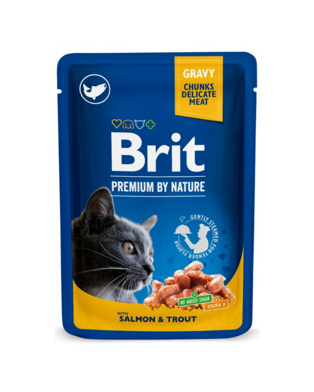 Premium-laatuinen täysravinto aikuisille kissoille kätevässä annospussissa. Brit Premiumin eläinkauppatasoinen märkäruoka on todellinen kalanystävän unelma: se sisältää lohta ja taimenta mehevässä kastikkeessa. Annoksessa on runsaasti kalaa, jolla omistaja houkuttelee kissan helposti ruokakupin ääreen nauttimaan hyvää tekevää ruokaa. Brit Premium -ruoat on suunniteltu kissan hyvinvointi edellä, luontainen ravinnontarve huomioiden. Annospussit eivät sisällä lisättyä sokeria eivätkä keinotekoisia väri- tai säilöntäaineita.