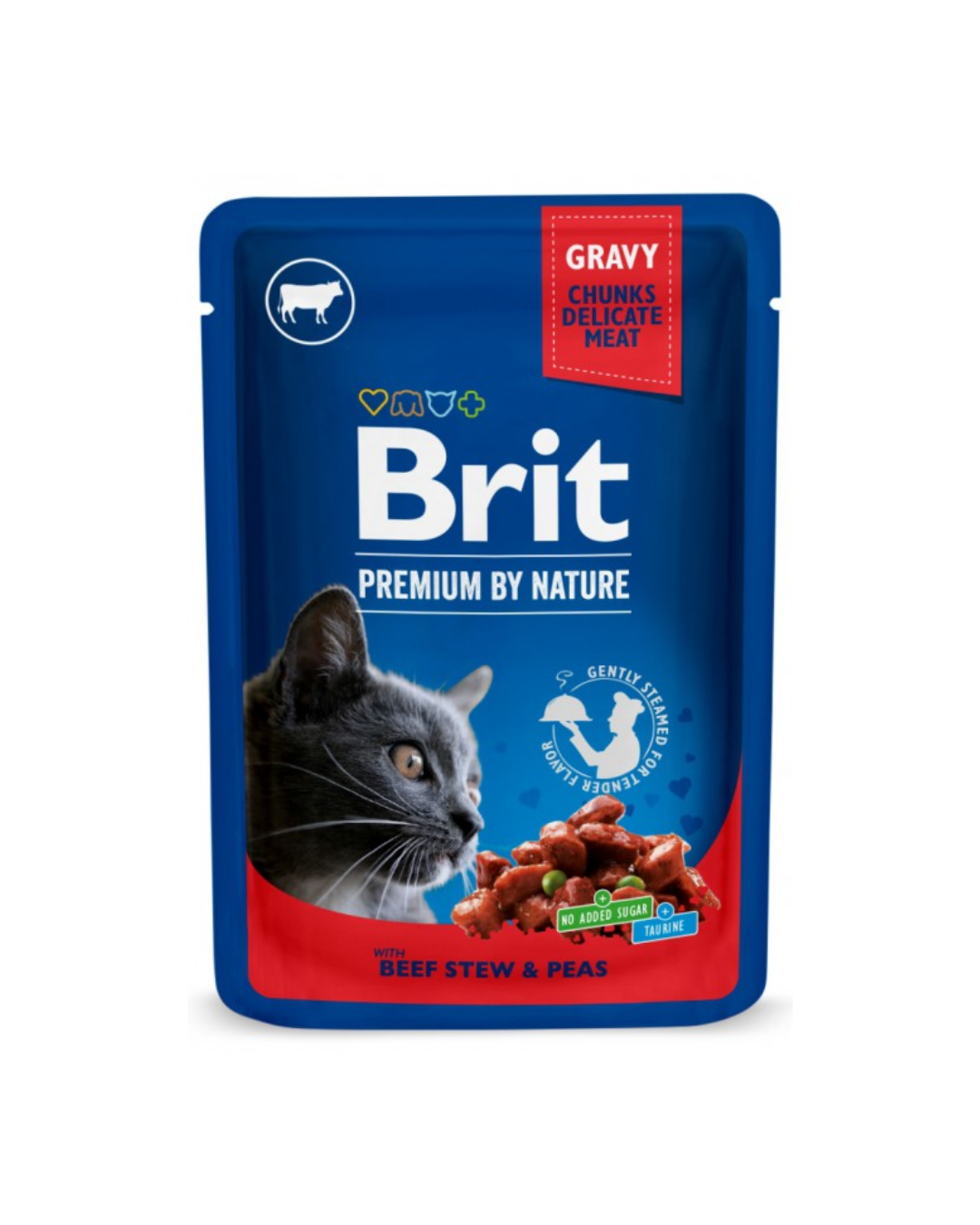 Premium-laatuinen täysravinto aikuisille kissoille. Tämä eläinkaupoista tutun Brit Premiumin laadukas märkäruoka sisältää herkullista nautaa ja herneitä kastikkeessa. Nauta on ylellinen herkku, jolla omistaja houkuttelee kissan helposti ruokakupin ääreen nauttimaan hyvää tekevää ruokaa. Brit Premium -ruoat on suunniteltu kissan hyvinvointi edellä, luontainen ravinnontarve huomioiden. Annospussit eivät sisällä lisättyä sokeria eivätkä keinotekoisia väri- tai säilöntäaineita.