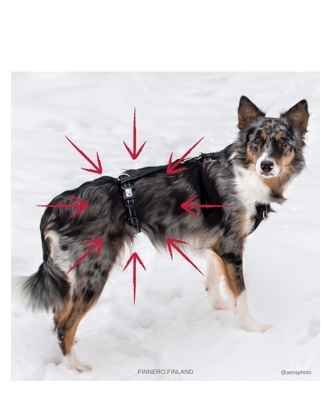 - turvapala varmistaa valjaan pysymisen koiran yllä