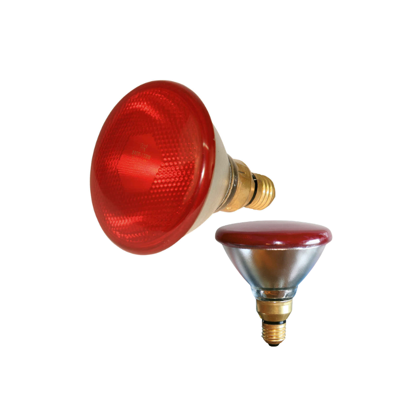 Punainen infrapuna lämpölamppu kestävää karkaistua lasia. Roiskeenkestävä. Maksimi käyttöikä noin 5000 tuntia. Kanta E27.