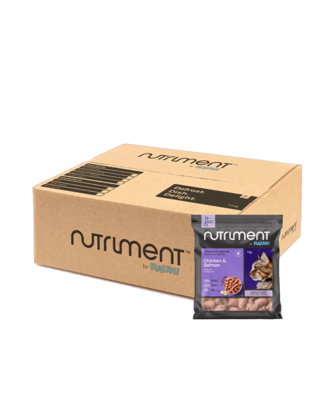 Nutriment by RAUH raakapakasteet on puhtaista raaka-aineista valmistettua raakaruokaa ilman säilöntäaineita. Kana-lohipullat on raaka täysravinto aikuisille kissoille. Se sisältää kissalle tärkeitä ravintoaineita, erityisesti Omega-3 rasvahappoja, kasviskuitua, karpaloa sekä tauriinia.