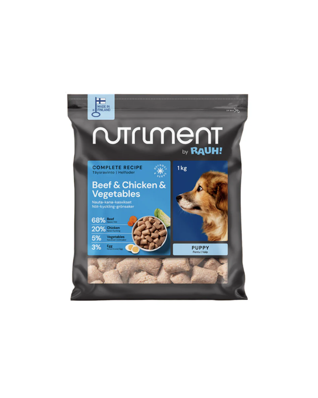 Nutriment by RAUH raakapakasteet on puhtaista raaka-aineista valmistettua raakaruokaa ilman säilöntäaineita. Nauta-kana-kasvispullat ovat oiva vaihtoehto pienen tai keskikokoisen pentusi täysravinnoksi noin 6 kk ikään asti. Se sisältää kaikki tarvittavat vitamiinit ja hivenaineet tarkkaan suunnitellulla reseptillä, ammattilaisten laskemassa suhteessa.