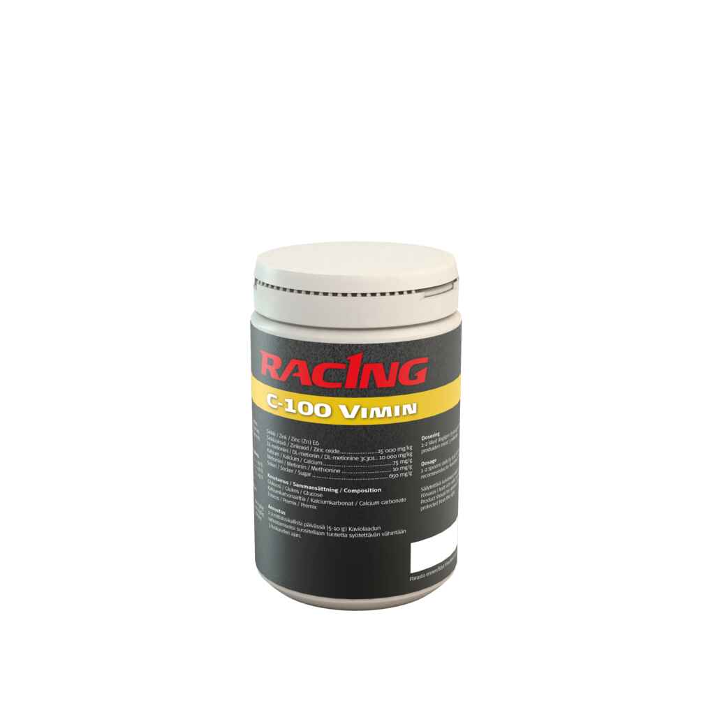 Racing C-100 Vimin on tarkoitettu kaikkien hevosten vitamiinihuoltoon. C-vitamiini vaikuttaa mm. veriarvoihin (raudan imeytymiseen) ja siten hapen aineenvaihduntaan.